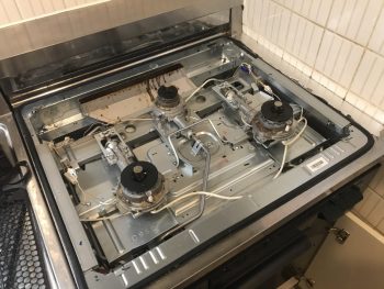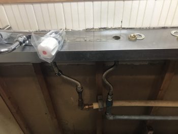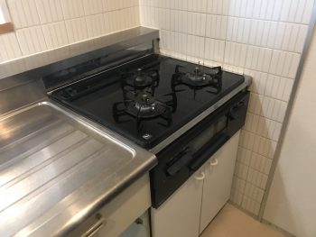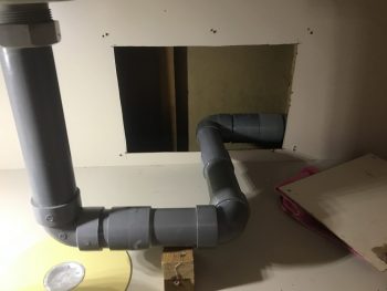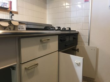 キッチン脱着しようとするも、ガス台と連結してあり、ガス屋さんと共に、ビルトインコンロも脱着。排水配管も更新して、完了。